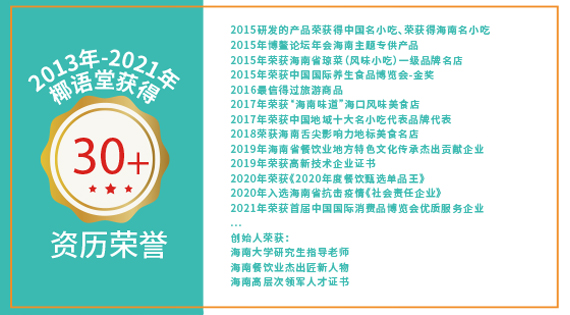 椰語堂公司介紹 椰語堂始創(chuàng)于2012年,是海南一家把海南清補(bǔ)涼為代表的特色小吃精致化、標(biāo)準(zhǔn)化并進(jìn)行連鎖發(fā)展的企業(yè),椰語堂專注于海南本土地域特色元素特別是椰子系列產(chǎn)品的深度研發(fā)。椰語堂被評(píng)為海南風(fēng)味小吃一級(jí)品牌名店,椰語堂多款小吃被評(píng)為海南名小吃、中國名小吃,并被選為中國地域十大名小吃代表品牌。椰語堂的全國門店分布在各高端商場(chǎng)、機(jī)場(chǎng)、郵輪、五星級(jí)酒店、動(dòng)車站、景區(qū)等。椰語堂清補(bǔ)涼被選為博鰲亞洲論壇專供產(chǎn)品、中國國際養(yǎng)生食品博覽會(huì)金獎(jiǎng)等殊榮,椰語堂清補(bǔ)涼在線下各連鎖賣場(chǎng)、盒馬鮮生、中石化易捷、中石油昆侖、全國30多家機(jī)場(chǎng)、五星、七星酒店等渠道銷售并成為政府及集團(tuán)采購產(chǎn)品。在電商線上渠道,椰語堂椰奶清補(bǔ)涼無論在銷量和好評(píng)方面是品類第一,是深受消費(fèi)者喜愛的高品質(zhì)產(chǎn)品。椰語堂是海南大學(xué)食品學(xué)院研究生實(shí)習(xí)基地,公司發(fā)揮椰語堂研究院優(yōu)勢(shì),擁有產(chǎn)品研發(fā)方面的多項(xiàng)專利。椰語堂因?yàn)槠鋬?yōu)秀品質(zhì)及良好顧客體驗(yàn),被中央電視臺(tái)、湖南衛(wèi)視、旅游衛(wèi)視等多家衛(wèi)視、人民日?qǐng)?bào)、中國縣域經(jīng)濟(jì)報(bào)、新浪、騰訊、SSBD等國內(nèi)外媒體報(bào)道宣揚(yáng)。椰語堂是海南文化的傳播和弘揚(yáng)者,是海南地標(biāo)美食品牌的優(yōu)秀代表和海南地域文化的一張亮麗名片,同時(shí),椰語堂也是中國連鎖經(jīng)營協(xié)會(huì)會(huì)員單位。 more |